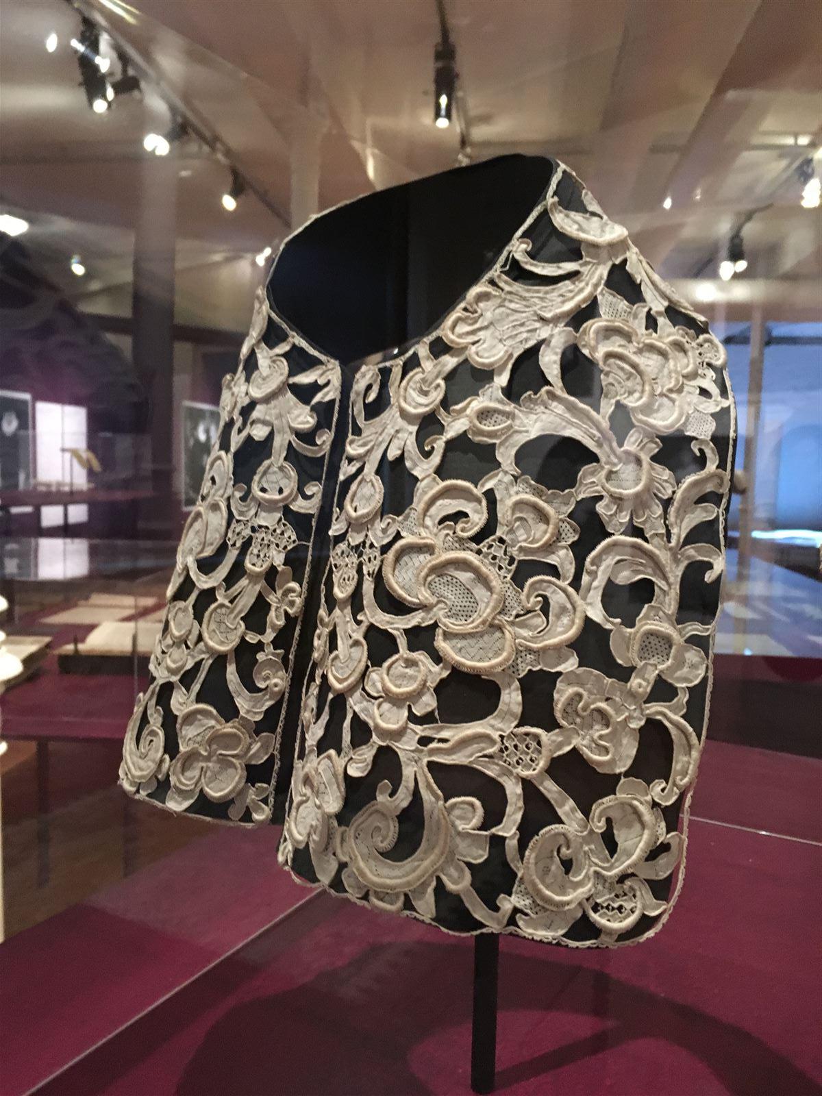 Deshalb wählt die Ausstellung im Textilmuseum St. Gallen nicht die Provinienz als Blickpunkt auf die Spitzen, sondern die höfische Kultur, die damals geschmacksprägend war. Der erste Raum ist geprägt von der strengen Mode des habsburgischen Spaniens vom 16. bis Mitte des 17. Jahrhunderts. Wir sehen hier Spitzen, die im streng regulierten höfischen Kontext Anfang des 15. Jahrhunderts entstanden sind. Die bordeauxrote Gestaltung spiegelt dabei die schwere der Kleidung wieder.