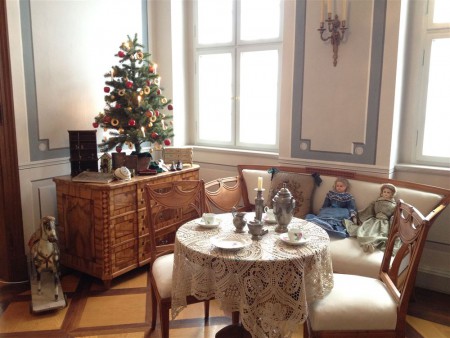 Zum Abschluss der Weihnachtsausstellung werfen wir noch eine Blick in die Stilzimmer und den Festsaal. Auch sie zeigen in eindrucksvoller Weise die Wohnkultur des Großbürgertum um 1800 und natürlich feiert man auch hier Weihnachten, der Gabentisch ist reich gefüllt und die Bäumchen schön geschmückt. Wie im Grünen Salon ein Bäumchen mit Anhängern aus Margarethenspitze.