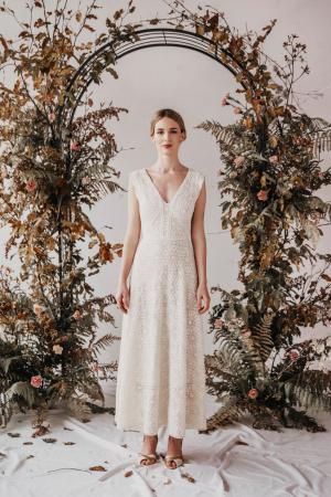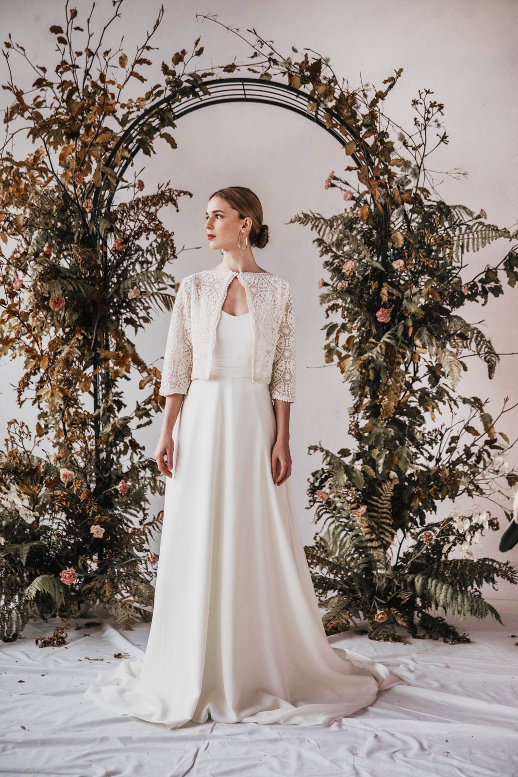 Die Kollektion kann auf die individuellen Wünsche der Braut angepasst werden. Entstanden ist eine weibliche Kollektion die Eleganz und Nachhaltigkeit perfekt miteinander verbindet. Stilmäßig liegt sie zwischen Boho-Look und Vintagecharme der 30er Jahre.